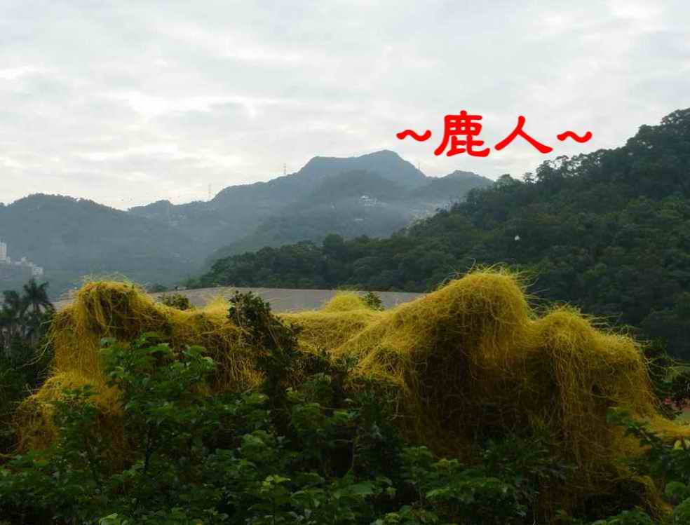 外來種稱兔絲子.像黃金般的線條...在這角度看如仰掌般.也似向著山上寺廟朝拜...