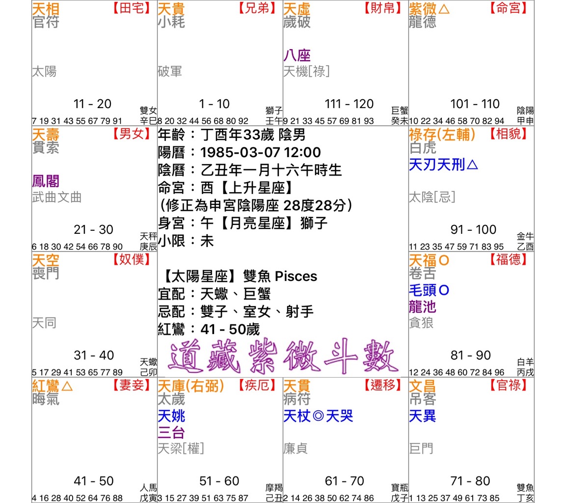 |微相昌星羊鸞使 厄| 陰男國曆 84 年 3 月 7 日 午 時生 |弼光碎空 |