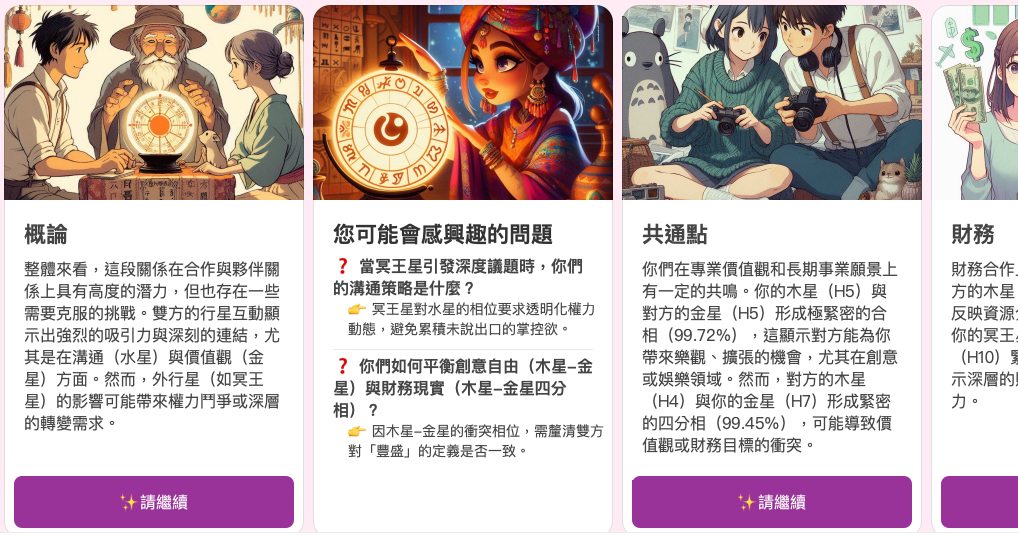 搭配你選擇的分析方向(感情、友誼等),自動聚焦最重要的相位與宮位,讓解讀更有溫度、更貼近實際互動。
